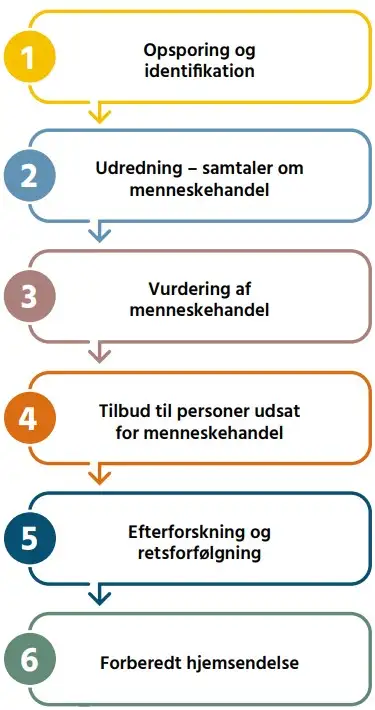 De danske retningslinjer består af nedenstående seks trin, som beskriver den proces, der går i gang, når der opstår mistanke om menneskehandel.